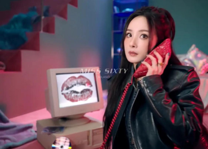 Miss Sixty这次拍的广告很复古又很前卫,杨幂身穿品牌的皮衣搭配了一条牛仔裤,脚上穿了一双豹纹细跟高跟鞋。这双豹纹高跟鞋很适合她,她慵懒的坐在地上,手里拿着复古造型的红色电话机。