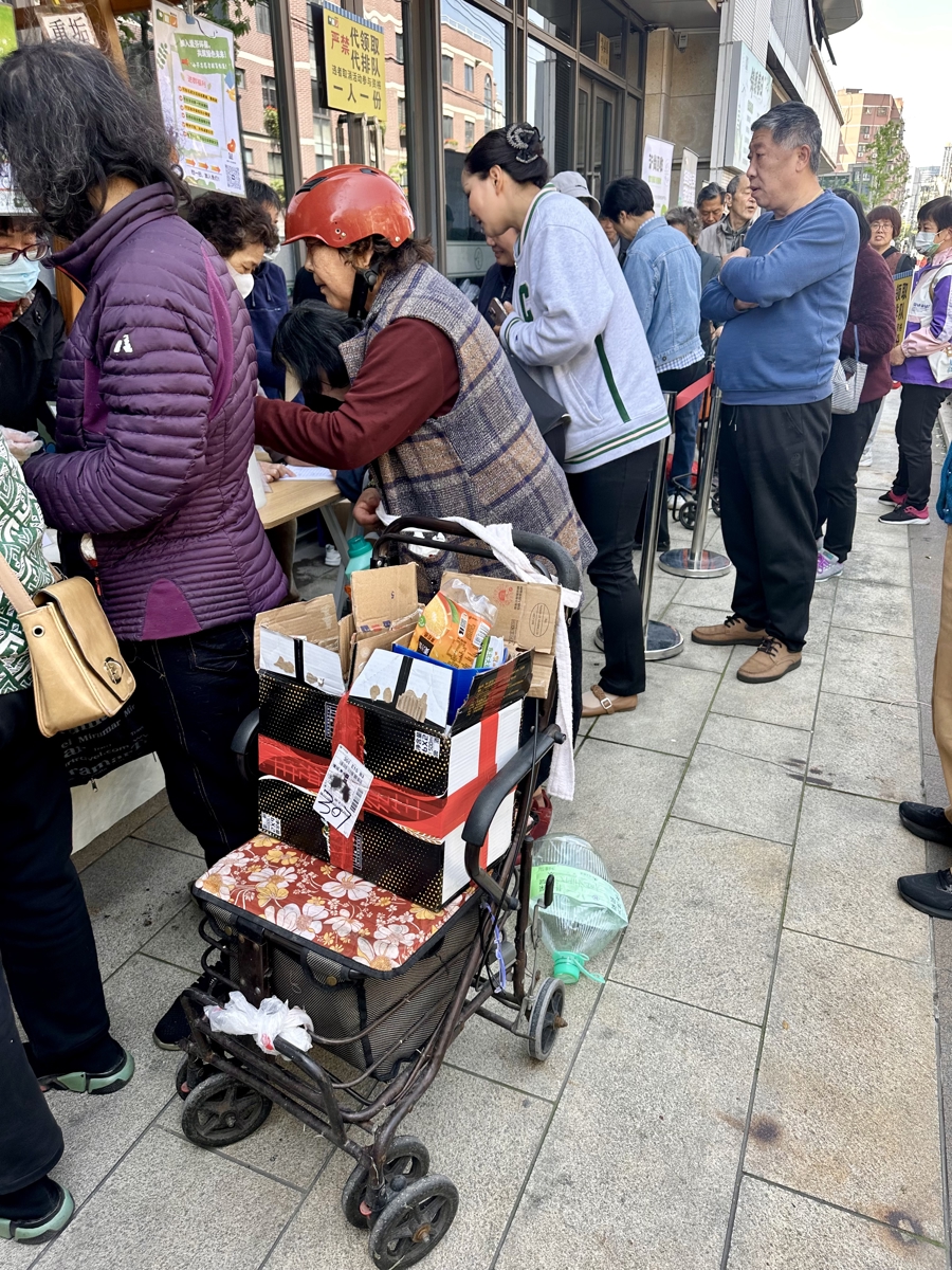 在青云路邻里中心门口,活动还未开始,就已经排起了长龙。居民们每人都带来了纸板、金属、旧衣物等可回收物,有的扎成一捆,有的索性用小拖车拉过来。
