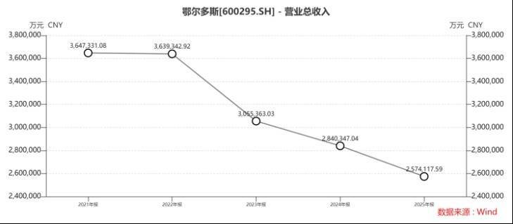 近日,上市公司鄂尔多斯(600295.SH)发布了2025年年报,公司全年实现营收257.41亿元,同比下滑9.37%,连续第四年呈现负增长;归母净利润则结束了连续三年下跌的颓势,同比增长27.93%至23.63亿元。
