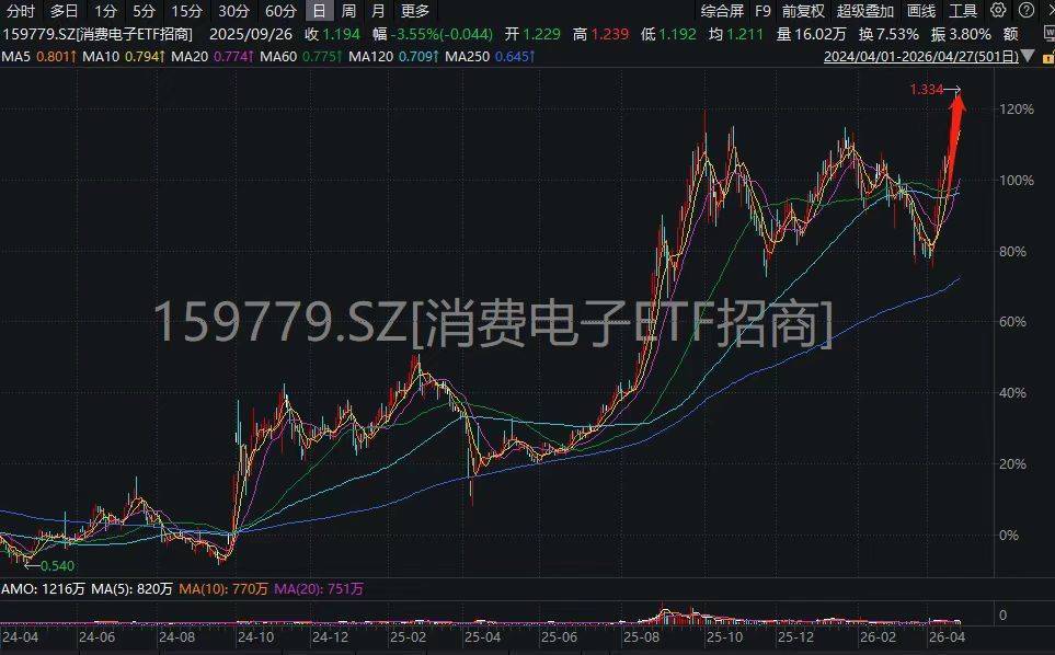 4月27日早盘,消费电子板块强势爆发。截至9时48分,消费电子ETF招商(159779) 放量上涨3%,盘中强势冲击历史新高。成分股表现亮眼——景旺电子怒封10CM涨停,立讯精密、鹏鼎控股等涨幅居前。